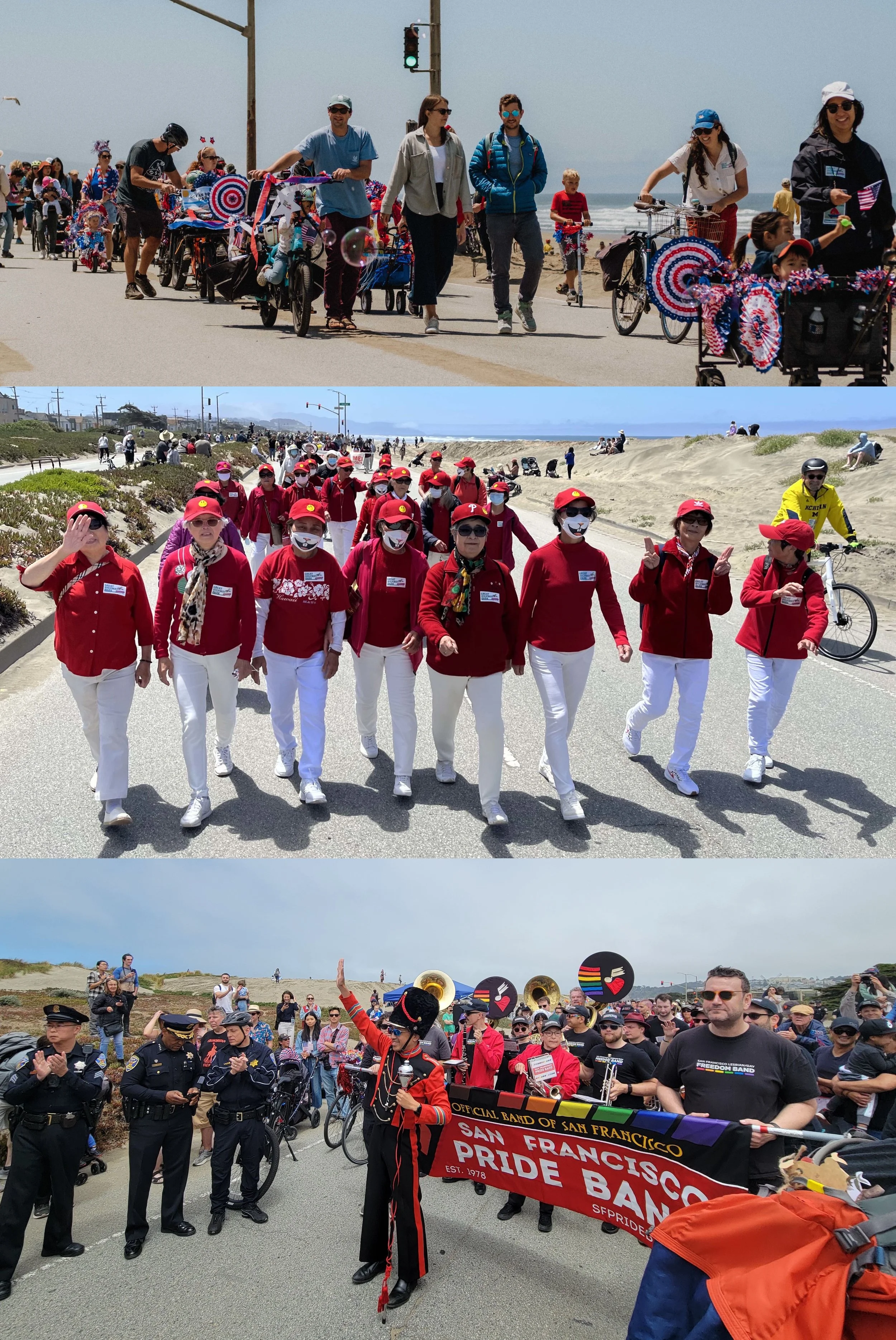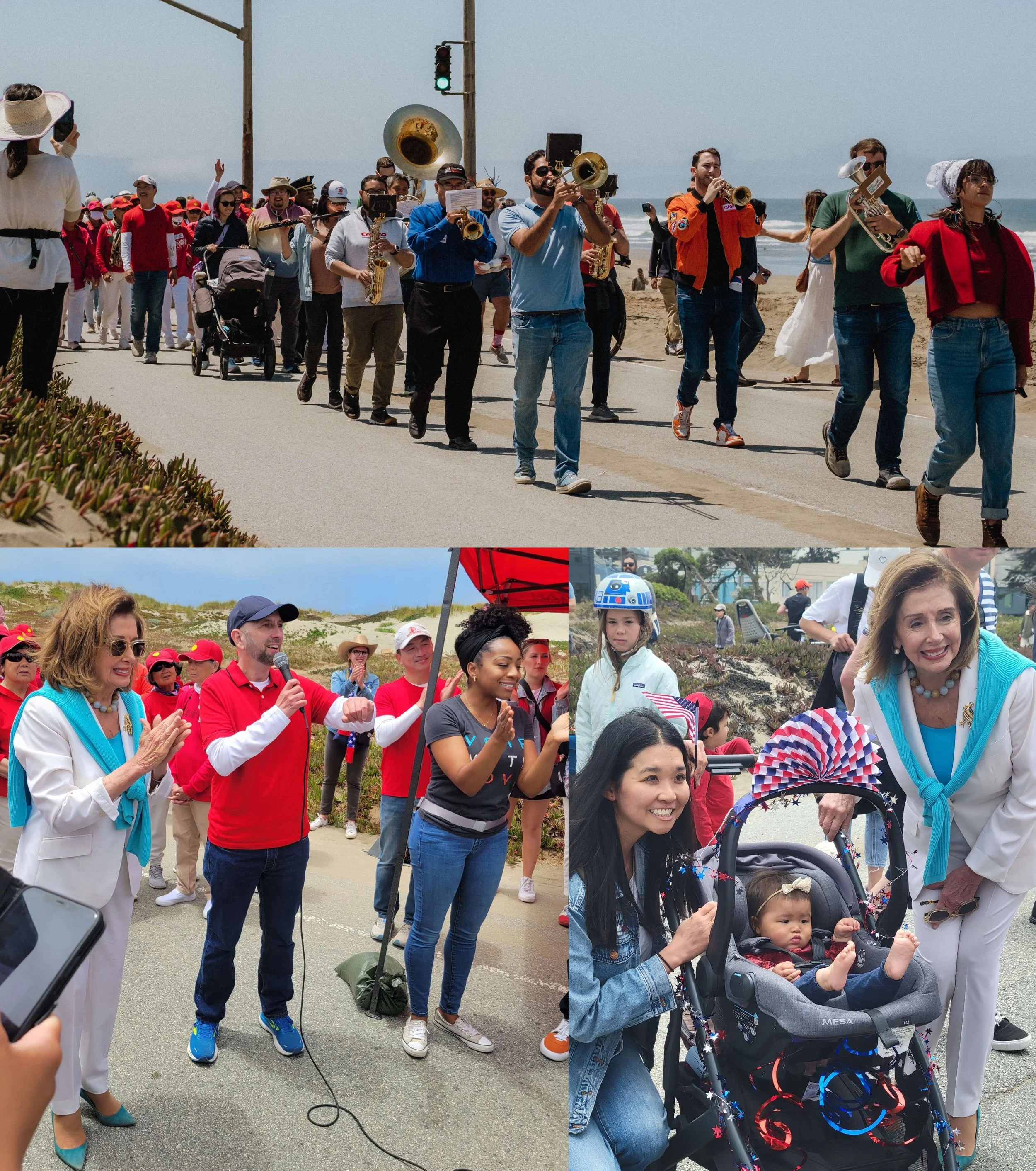 Top: The Sunset Community Band at Sunset Dunes for the 2024 Fourth of July parade. Bottom: Nancy Pelosi and Joel Engardio speak to the crowd