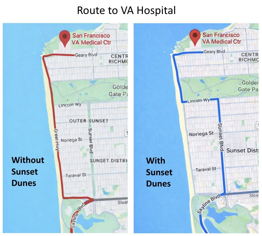 The creation of Sunset Dunes does not impede travel to the VA Hospital or the Richmond District. Most continue to use the same route. Some have a slightly different route, but that’s because the southern section of the Great Highway was going to close no matter what. Traffic had to divert inland, either at Sloat (red line) or Lincoln (blue line). Diverting at Lincoln and using the parallel Sunset Boulevard is the same distance as the Great Highway route. The Great Highway remains open to cars north of Lincoln and the connection between the Sunset and Richmond neighborhoods is unchanged.
