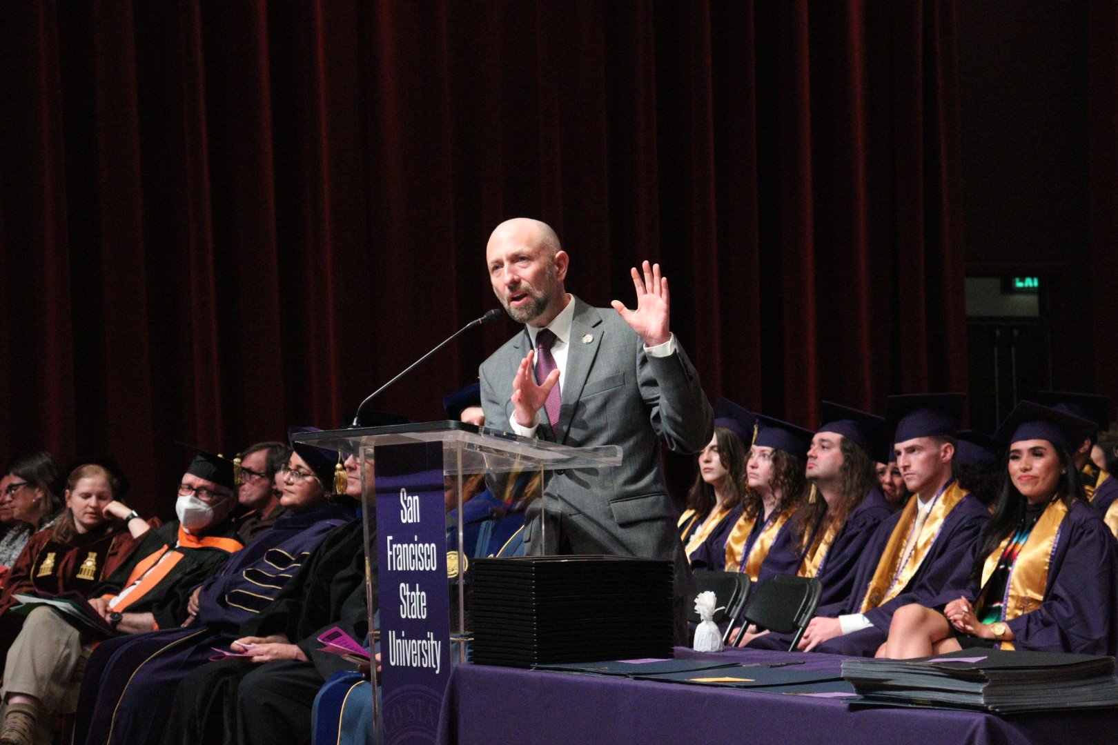 Joel Engardio speaks to political science graduates at San Francisco State University in 2024.