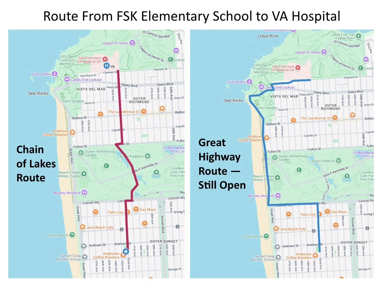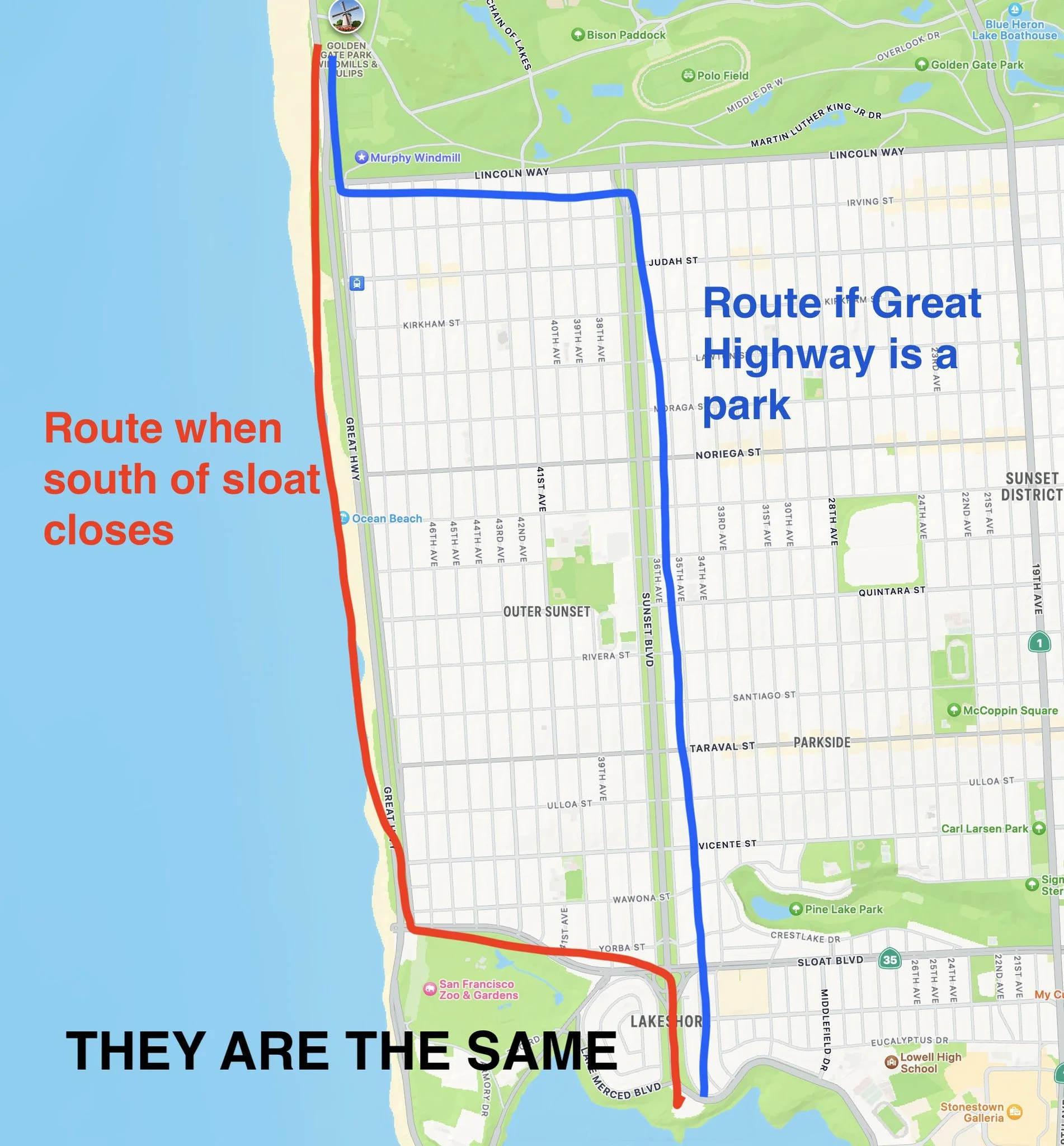 What about getting to important places like the VA hospital in the Richmond district? Most routes haven’t changed. The Great Highway remains open to cars 24/7 on the northern section that actually connects the Sunset and Richmond neighborhoods.