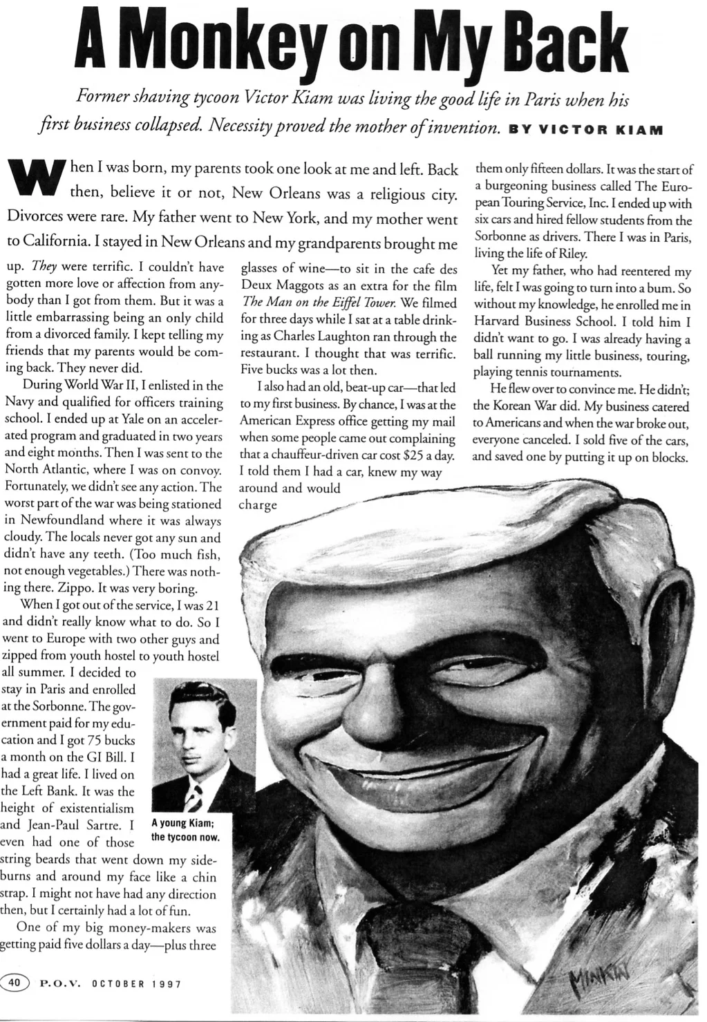 Victor Kiam was an entrepreneur who famously pitched his Remington electric shavers on popularTV commercials in the 1980s. Kiam was interviewed by Joel Engardio for the POV magazine column "When I Was 25" where successful people talk about their formative days. The POV essay was written by Joel Engardio based on his recorded interview with Kiam.